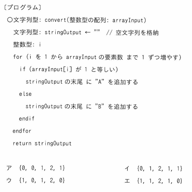 関数convertは、整数型の配列を一定のルールで文字列に変換するプログラムである。関数convertを convert(arrayInput) として呼び出したときの戻り値が “AABAB” になる引数 arrayInput の値はどれか。ここで、arrayInput の要素数は1以上とし、配列の要素番号は1から始まる。
